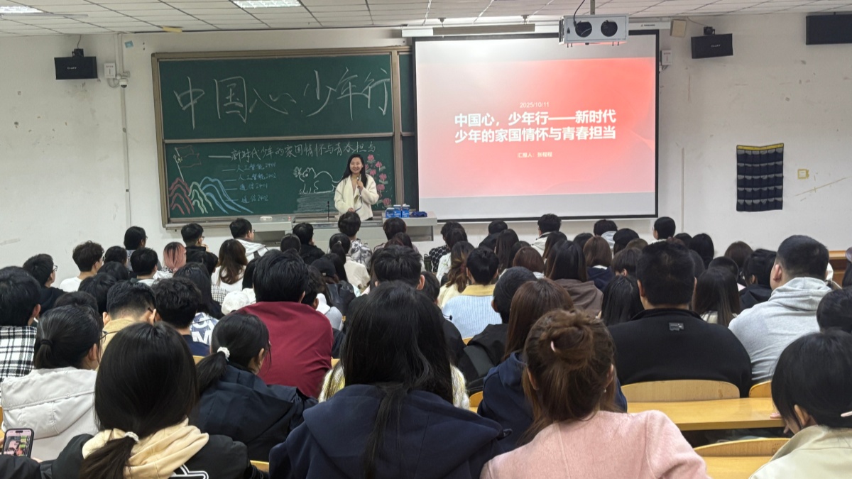 为厚植学生爱国情感,引导学生树立强国志向、践行报国行动,10月11日晚上,一场以“中国心,少年行”为主题的辅导员说完满活动在二号教学楼举办,辅导员张程程老师带领学生在对家国情怀与青春担当的深度探讨中,明晰成长方向,汲取前行力量。