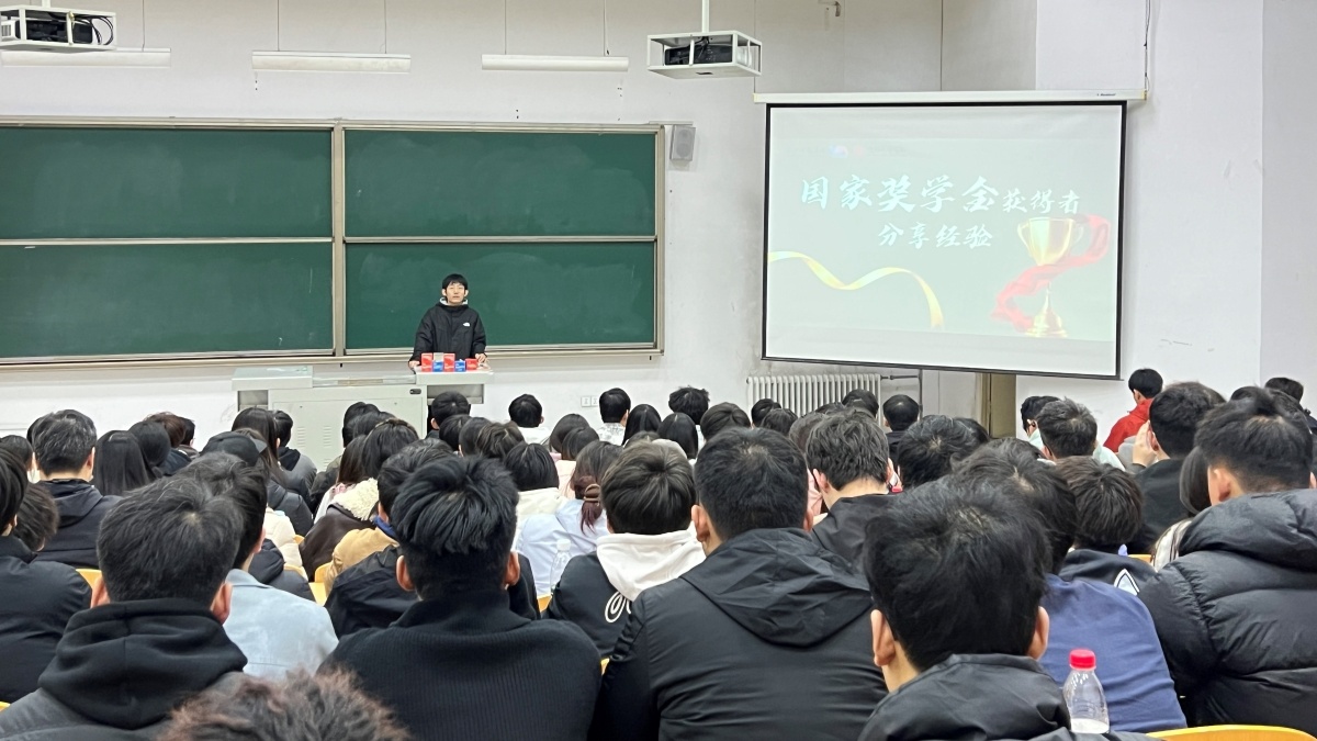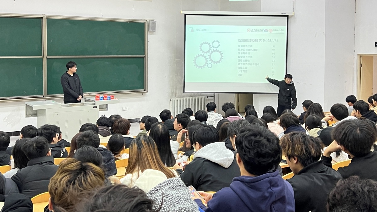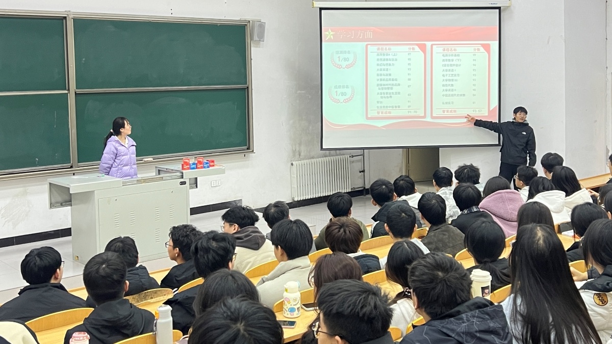 为将奋斗与担当的精神具体化、形象化,会议特别邀请了电子2401班丁晓娜和电子2302班武大坚两位国家奖学金获得者进行分享。他们结合自身的学习与成长经历,生动诠释了“奋斗点亮青春”的实践路径。丁晓娜同学从高效学习方法、时间管理策略以及参与学科竞赛的心得入手,讲述了如何在学习中保持专注与热情,她提到“将大目标分解为每日可执行的小步骤,让奋斗成为一种习惯”;武大坚同学则围绕科研探索、项目实践与志愿服务,分享了如何在挑战中突破自我,他认为“担当就是在集体需要时主动站出来,在困难面前多坚持一下”。两位同学的真诚分享,为在场同学提供了可学可做的榜样,让大家看到奋斗的青春如何结出硕果。