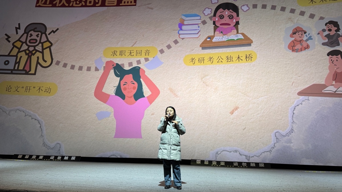 活动伊始卢翘楚老师以大屏上的“四大状态漫画”为引,正式开启“形势与我们都一样”毕业通关主题辅导,用一份可视化清单为同学们驱散迷雾,标记出论文、答辩与手续的每一步坐标,让“盲盒”变“蓝图”,助力全体学子在临行前置备满格能量,稳步迈向下一阶段人生。