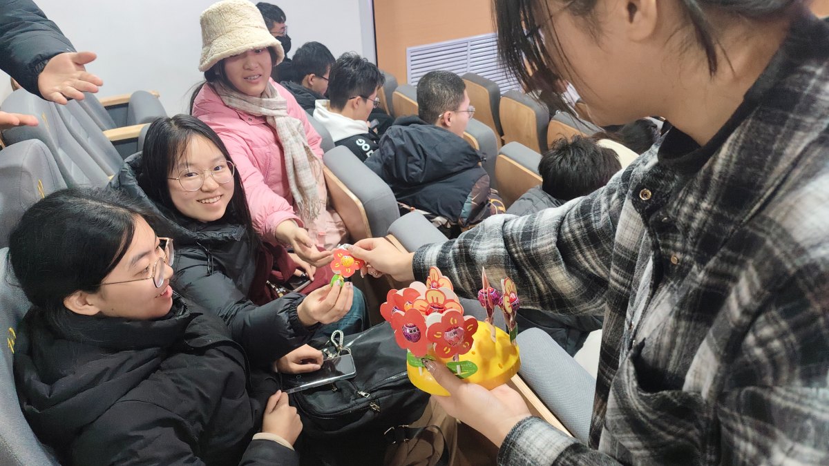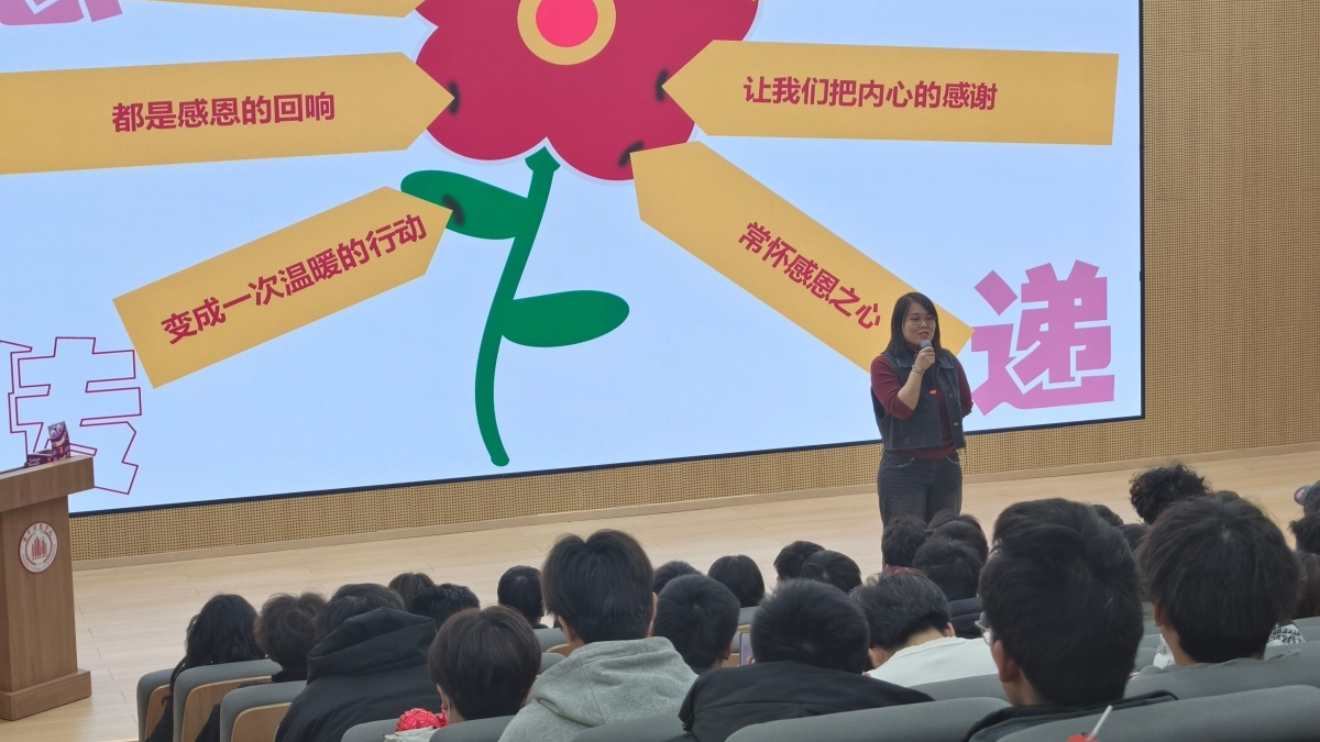 活动最后,辅导员国画老师分享了彩蛋环节,邀请部分同学将同学们精心制作的小红花和写有感恩纸条的“感恩饼干”,送到校园的每个角落。同学们将走出报告厅,将这份心意送给校园里那些默默付出的人——食堂里忙碌打饭的阿姨、认真值守的保安大爷、办公室耐心答疑的老师,还有平日里互帮互助的同学。每一份礼物的送出,都将伴随着真诚的感恩,也会收获对方温暖的笑容。