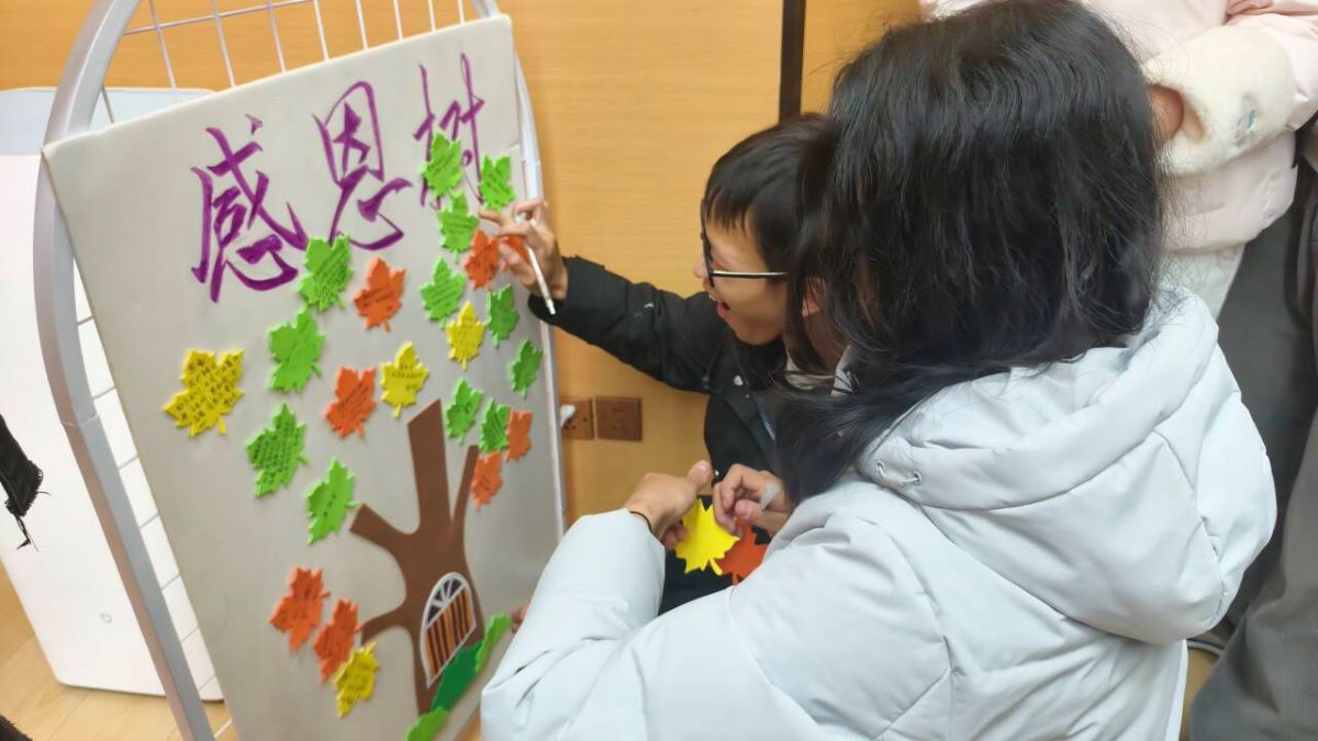 有的同学画了一碗热气腾腾的面条,旁边写着“感恩食堂阿姨,每天清晨的烟火气,是我大学的第一份温暖”;有的同学用稚嫩的笔触勾勒出保安大爷的身影,配文“谢谢您在寒夜里的坚守,让校园的安全感从未缺席”;也有同学写下对老师的谢意,“感恩您在我迷茫时的指引,让我在专业路上走得更坚定”,还有同学一笔一划写下“感谢自己——谢谢没放弃的我”。当这些“树叶”被一一贴在白板做成的“感恩树”上,原本光秃秃的枝干,渐渐变得郁郁葱葱。