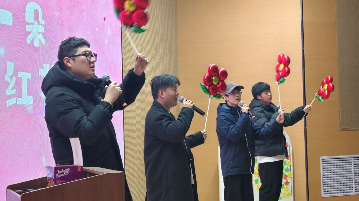 “送你一朵小红花,开在你昨天新长的枝桠……”四位同学拿着小红花和话筒,从同学们中缓缓起身走向舞台。随着歌声律动,台下的同学也纷纷加入合唱环节,大家共同晃动手中的小红花或手机闪光灯,用饱满的歌声传递着心中的敬意与谢意。同时,辅导员国画老师也为大家分享了装饰着小红花的棒棒糖,她说道:“小红花不仅是奖励,更是一份‘被看见’的温暖。每一朵小红花都代表一份温暖与认可,我将小红花传递给大家,也希望同学们可以成为别人的‘小红花’,请大家记得我们不仅是感恩的接收者,也可以成为那个赠予他人温暖的人。”此刻的小红花,是唱进歌里的感谢,也是藏在糖里的温柔。