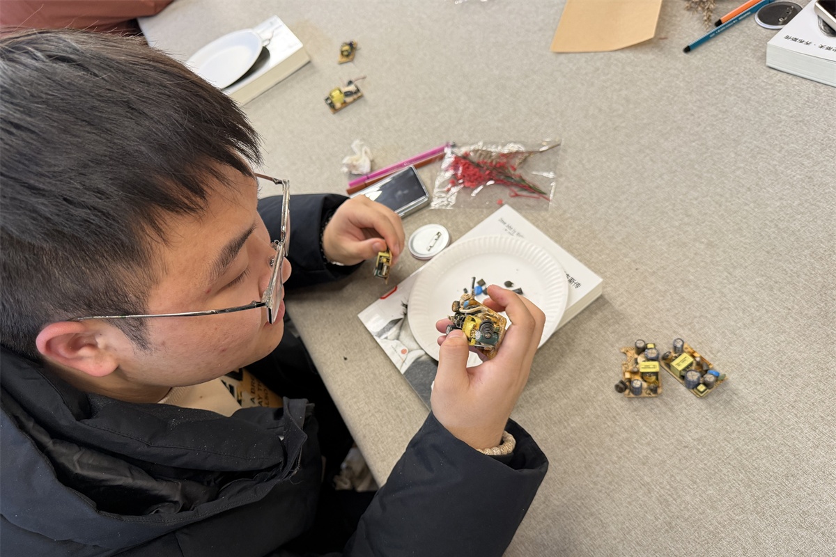 紧接着的“专业苹果”创作环节更添惊喜:擅长硬件的同学将废弃电路板剪成碎片,粘贴出“苹果内核”,象征对智能硬件研发的热爱;有人融入自然植物元素,以干花点缀“苹果”边缘,诠释科技与自然共生的理念。创作间,“这个电路板边角要磨平才安全”“我们可以这么拼接设计”的交流声此起彼伏,原本普通的材料,在专业与创意的碰撞中,变成了承载个人理想与专业追求的艺术品。