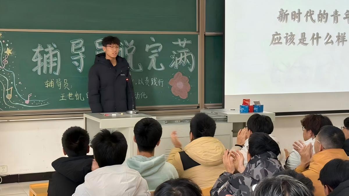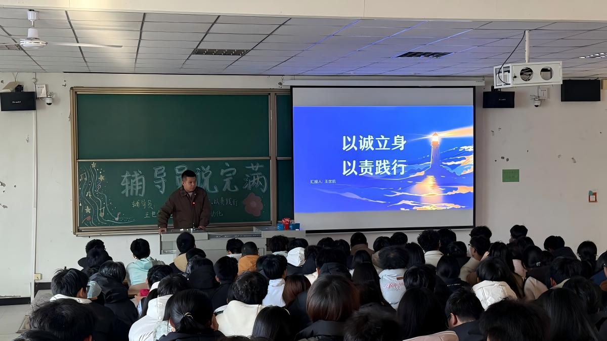 “作业抄得爽,考试心慌慌”“宿舍值日不偷懒,集体才是温暖家”12月3日下午智能工程学院2025级辅导员王世凯老师一场别开生面的主题分享会在2教401热闹开讲。没有枯燥的说教,没有生硬的道理。现场屏幕上,暖黄色灯塔微光穿透云层,搭配“解锁成长密码”“读懂诚与责”的指引,瞬间营造出温暖有力量的氛围,让“诚信”与“责任”两个关键词变得鲜活又好懂。