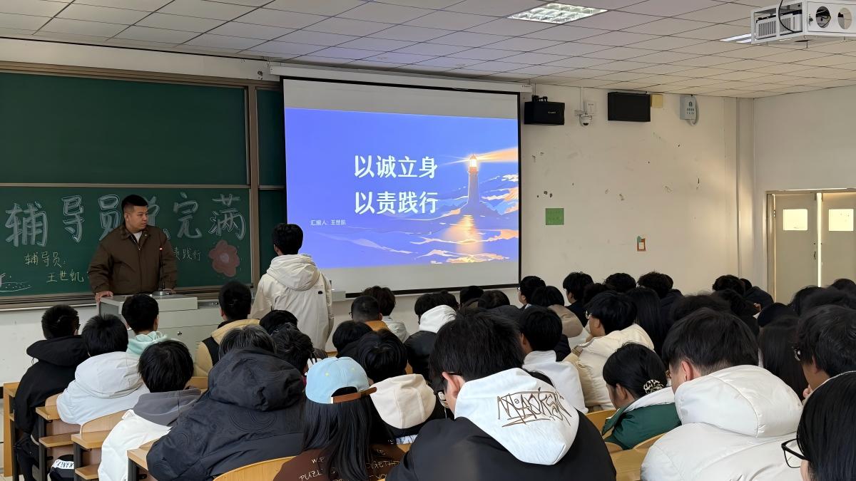 在“以诚立身:做有温度的大学生”篇章中,王老师从“诚信于学业”“诚信于他人”“诚信于自我”三个维度展开,用一个个真实的校园小故事传递诚信的力量。 王老师还提到,诚信不仅是对他人的承诺,更是对自己的负责。“刚入学时,总觉得专业课很难,遇到不会的题目就想抄答案蒙混过关。但后来发现,抄来的答案永远变不成自己的知识,考试时还是会手足无措。”学习委员说:“现在我每天坚持独立完成作业,遇到难题就向老师同学请教,虽然过程累了点,但每次解开题目时的成就感,是抄作业永远得不到的。”这些发生在身边的真实案例,让同学们深刻体会到,诚信是成长的“底气密码”,不抄袭、不欺瞒的坚守,能让人在求知路上收获真才实学,在人际交往中赢得真心信赖。