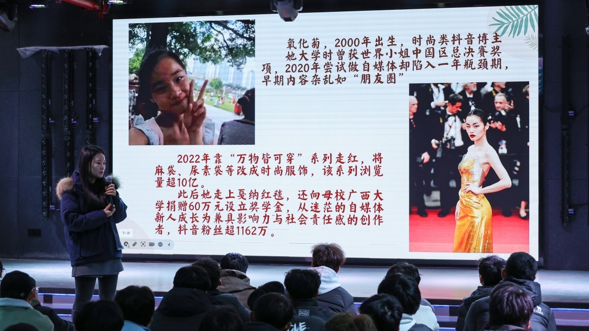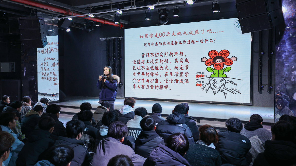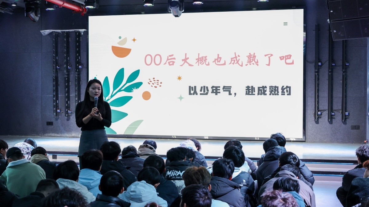开场环节,任文姣老师以视频展示的方式,向同学们展示了各行各业较为“闪耀”的00后,她提到抖音创作者氧化菊从内容迷茫到创意出圈、并回馈母校设立奖学金的经历,也谈到篮球少年杨瀚森从训练场走向国际赛场的坚持,更提到那些在国际赛场上为国争光的00后群体,“他们的道路不同,但内核一致:以热爱引领方向,以担当定义成长。”她期望同学们能够清楚地意识到,当前的社会环境中,00后已经成为了各行各业不可或缺的主力军,而真正的成熟,不是被动长大,而是带着少年气,主动迎接挑战、扛起责任。