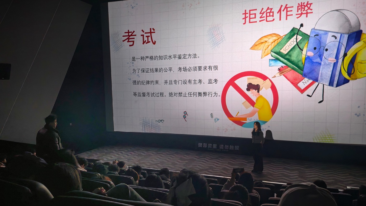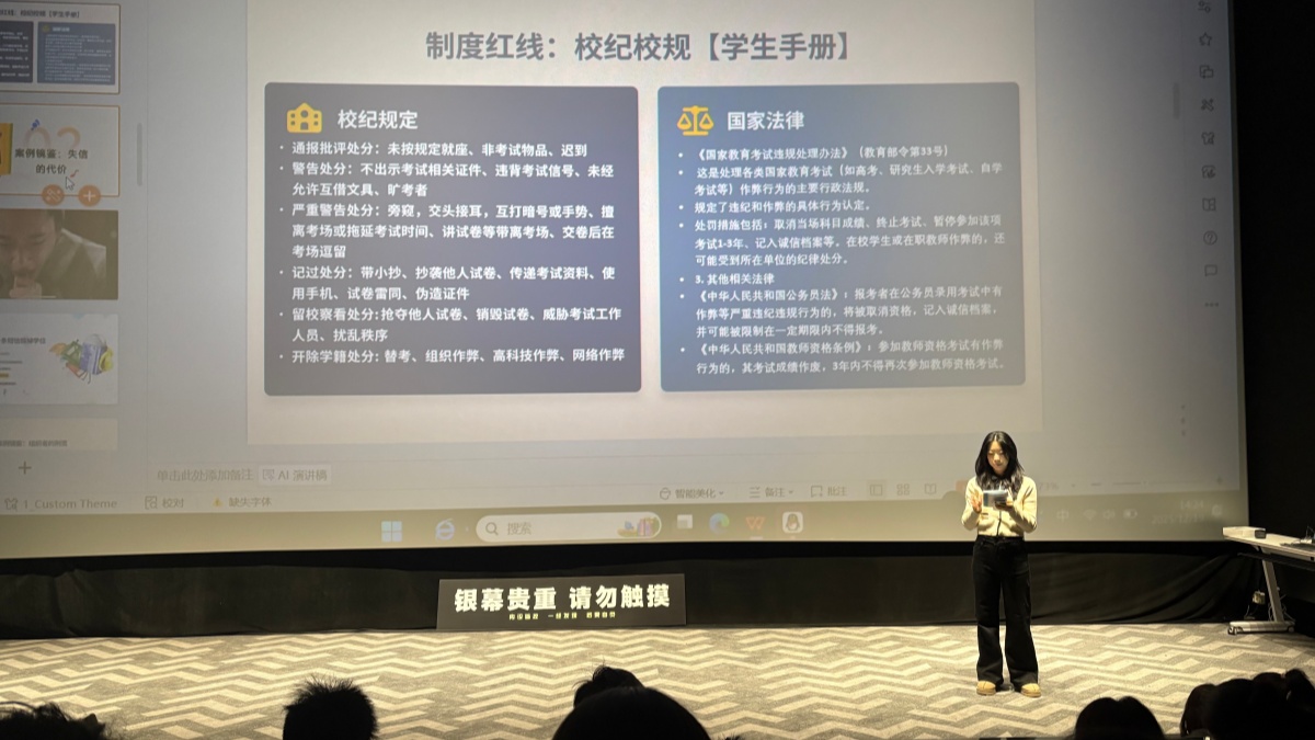 “一次作弊,可能让多年的努力付诸东流。”索雨彤老师以“案例鉴鉴:诚信的代价”为主题,展示了校内外考试失信的真实案例:有学生因期末考试作弊被取消学位证书,多年寒窗苦读的成果毁于一旦;有团队因竞赛数据造假,不仅失去奖项资格,更损害了学院声誉;还有毕业生因在校期间的诚信档案污点,错失心仪的就业机会。同时,索老师详细解读了学校考风考纪的制度红线,明确了作弊行为的处分细则,从制度约束与实际后果双重维度,让学生深刻认识到考试失信的严重影响,筑牢“不敢违、不能违、不想违”的思想防线。