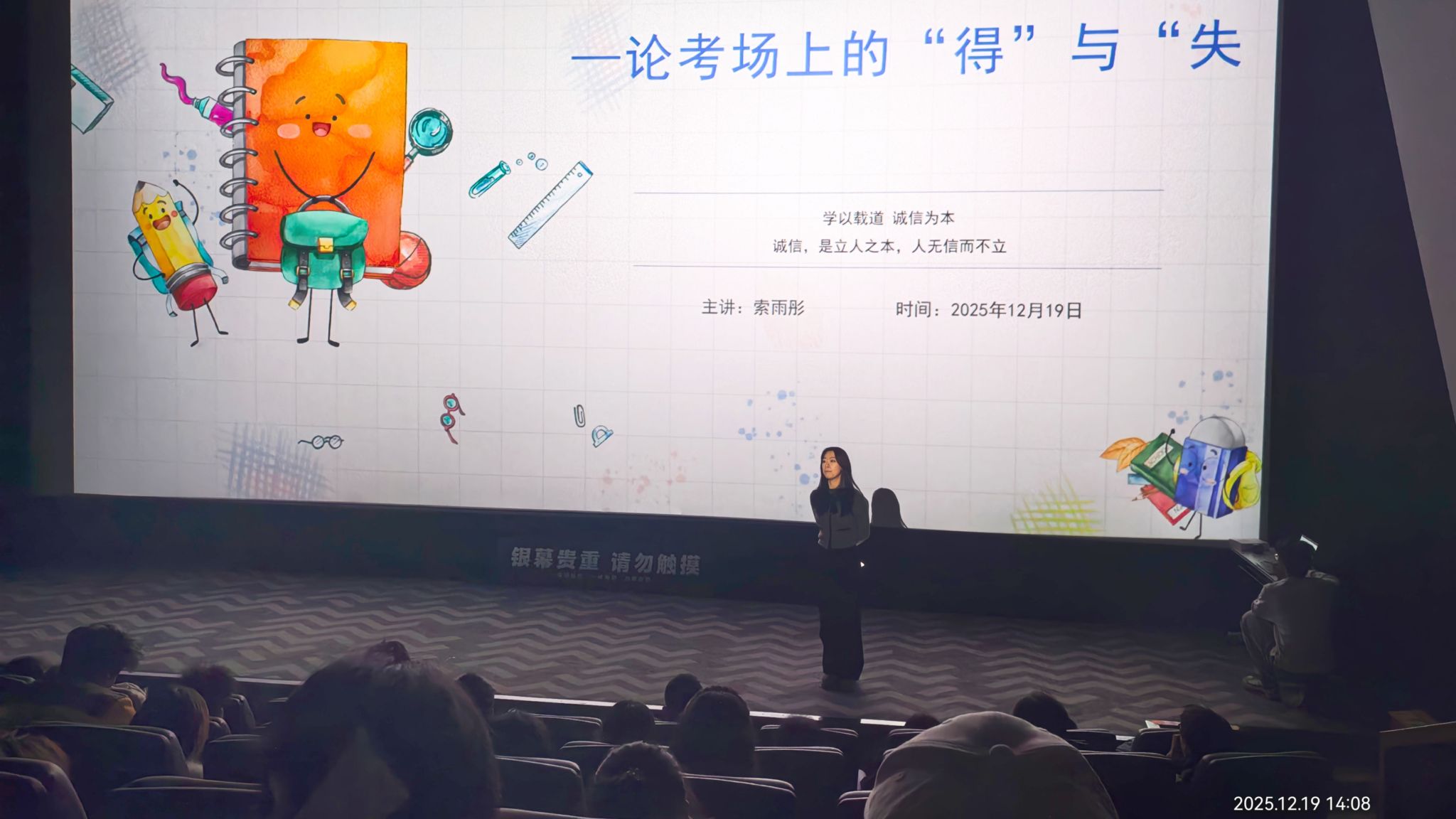 为引导学生树立正确的考试观与诚信价值观,筑牢校园考风考纪防线,在期末考试季来临之际,晋中信息学院智能工程学院索雨彤老师于12月19日下午开展以“分数诚可贵,诚信价更高”为主题的辅导员说完满活动。活动从诚信内涵解读、考试心理疏导、失信代价警示到实践行动倡议层层深入,更以“传递诚信之光”的互动环节凝聚青春共识,让诚信理念扎根学生心中,为学院优良学风建设注入精神底色。