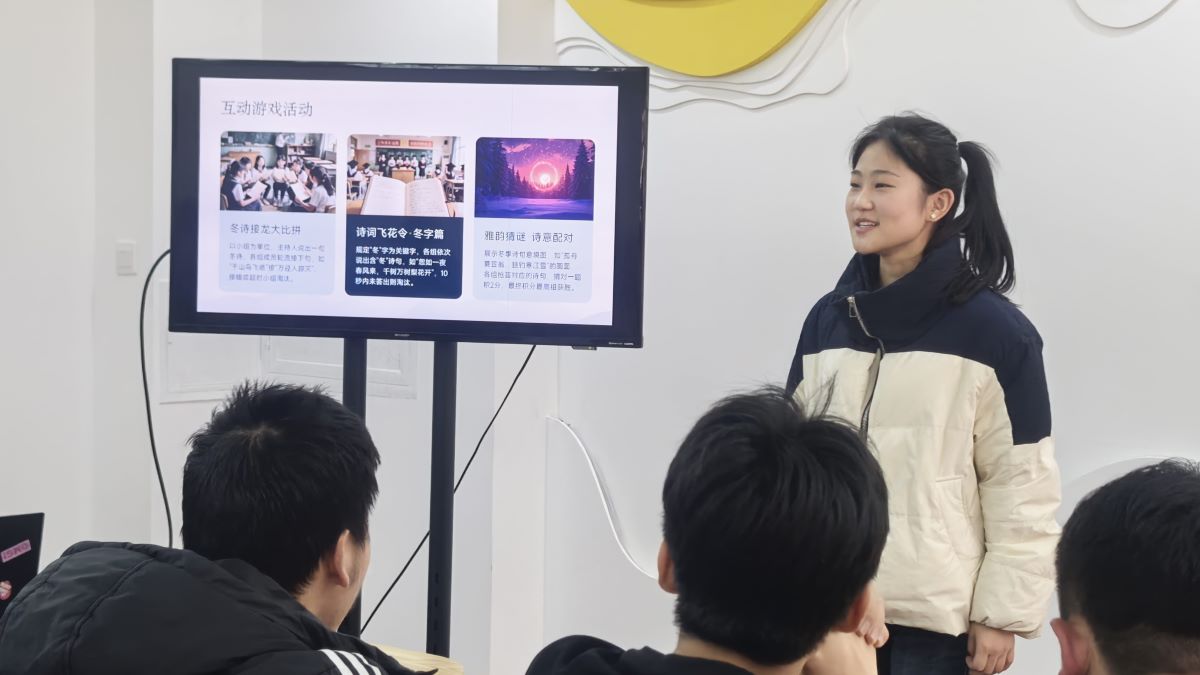 电气2403班于12月19日下午在太行书院朋辈·协作共享区举办了一场“诵冬雅韵”冬至古诗散文朗诵会主题活动,本次活动以“朗诵+民乐+视觉背景”的多感官融合形式,将冬至节气与古典文学、艺术审美有机结合,为同学们搭建了一个感受经典、展示自我的文化平台。活动现场布置简洁而雅致,柔和的灯光、冬日主题的背景画面与一旁摆放的民乐乐器相得益彰,营造出静谧而温暖的氛围。在所有环节完成后,冬至不再只是日历上的一个节点、餐桌上的一顿美食,而成为一种可听、可看、可感的文化体验,成为同学们心中一段难忘的诗意记忆。