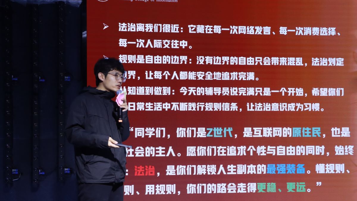 为助力大三学生明晰法律边界,将法治意识内化为行为准则、把规则观念转化为成长底气,3月11日中午,智能工程学院辅导员闫星宇开展了以“当‘Z世代’遇上法治:如何解锁你的完满副本”为主题的辅导员说完满主题年级会。本次辅导员说完满紧扣大三学生“互联网原住民”的群体特质与成长阶段特点,以“法治盲区破解”为切入点,以“规则意识树立”为落脚点,通过沉浸式体验与互动共创相结合的形式,让抽象的法律知识转化为可感、可行的日常行动。