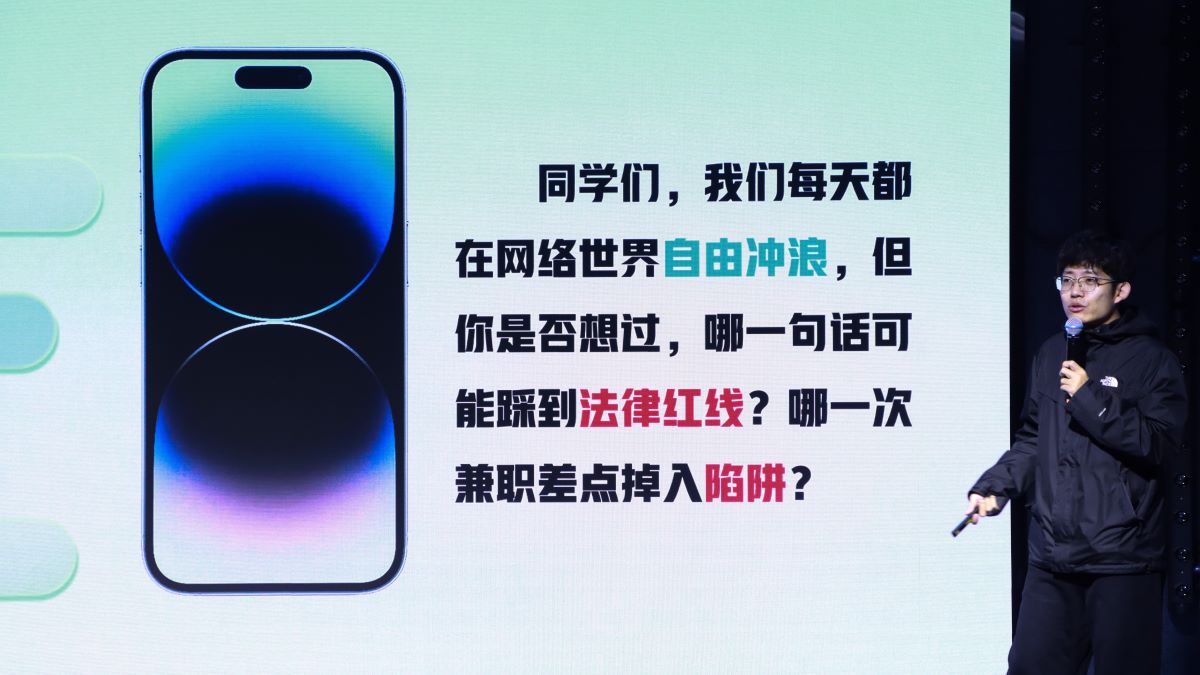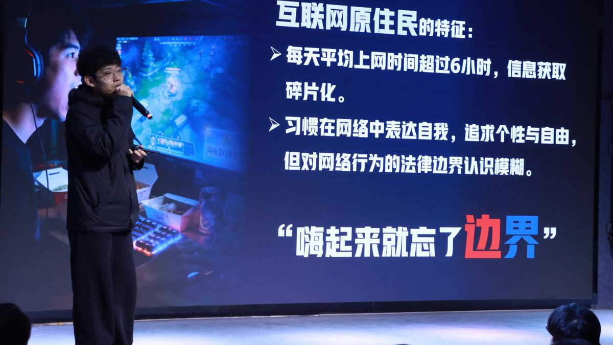 “大家都是互联网原住民,天天在网上冲浪、在宿舍躺平、在兼职群里找‘财富密码’,但你们知道吗?你们可能一直在‘法律雷区’里蹦迪!”闫星宇老师一开场就甩出金句,瞬间点燃全场氛围。