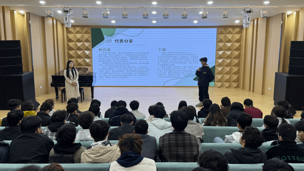 到了互动环节,任老师让大家现场思考:你目前最缺哪一项?你最想从哪开始改变?几位同学主动走上台分享自己的“撑腰清单”,真诚又动人:鲍慧杰同学坦言自己最欠缺“坚持力”,计划通过微习惯养成、建立瓶颈止损机制、邀请同伴监督等方式,在规则之内稳步坚持,找回生活节奏。武则周、林浩森同学坦言最欠缺自我情绪管理与人际边界的建立,计划从守住专属学习时间、温和拒绝不合理请求开始改变;王瑜同学意识到自己缺乏驾驭生活节奏的自主力,决定用四象限法则划分任务、预留独处时间,在微观秩序里找回掌控感。这些带着烟火气的分享,让“撑腰”不再是一句口号,变成了每个人都能践行的成长计划。