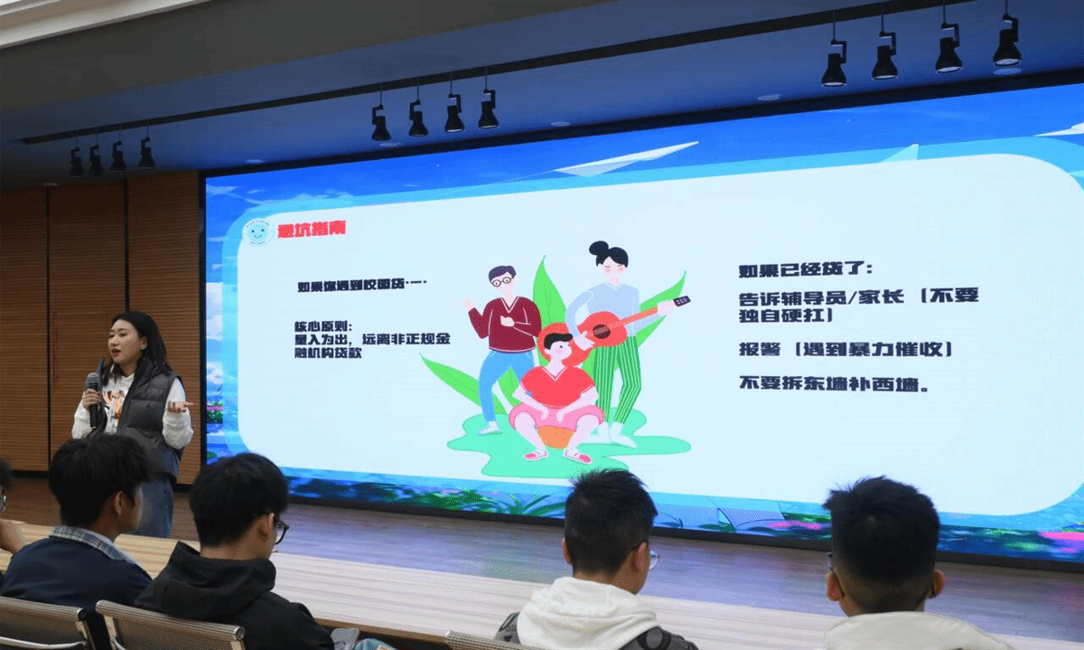 在“网络兼职诈骗”板块,贾漫老师通过“刷单返利”真实案例,深入剖析诈骗分子“小额返利、大额投入、系统错误、拉黑”的典型套路,并讲解了诈骗罪的定罪量刑标准,总结出凡是先交钱的兼职都是诈骗的核心口诀,帮助学生快速识别诈骗陷阱。在校园贷陷阱板块,结合“裸条贷”“培训贷”等触目惊心的案例,讲解民间借贷利率红线及非法催收涉及的敲诈勒索罪、侵犯公民个人信息罪,引导学生量入为出、理性消费,遇到问题及时向辅导员、家长求助或报警。