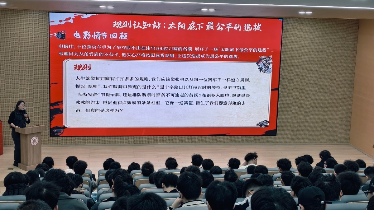 活动初始,以热门影片《飞驰人生》为切入点,通过片段赏析与情节回顾,让同学们直观感受规则在人生赛道中的重要意义。国画老师指出,规则并非束缚,而是守护生活的底线与保障,如同轨道指引方向,标尺衡量公平,让秩序与安全相伴而行。