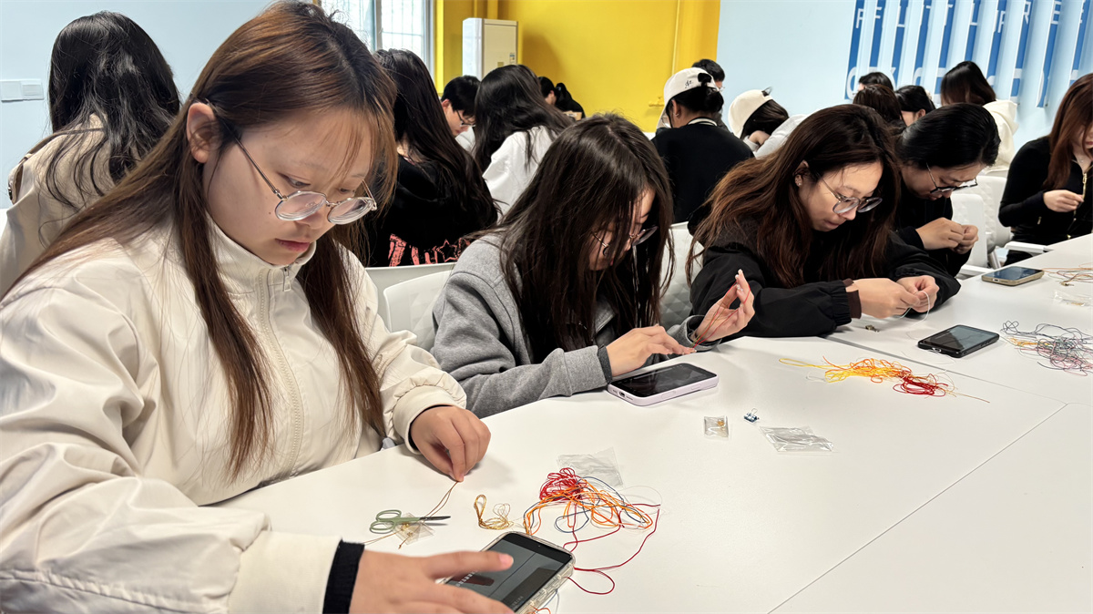 为丰富同学们的课余文化生活,传承中华优秀传统编绳文化,进一步增强班级凝聚力与动手实践能力,4月2日中午,通信2401班在向山·太行会议室开展了“巧手编绳寄心意,指尖传承润青春”手绳编织主题活动,全体同学积极参与其中,在丝线的缠绕穿梭间感受传统手工艺的独特魅力,在协作互助中凝聚班级温情,共赴一场充满创意与温度的手作之约。本次手绳编织主题活动,以传统手工艺为载体,既让同学们在实践中传承了中华优秀传统文化,提升了动手能力与审美素养,又有效锤炼了大家的团队协作意识,进一步增强了班级的凝聚力与向心力。