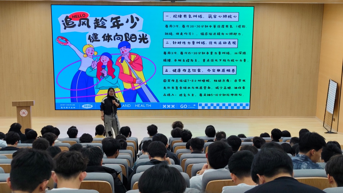 为深入贯彻落实教育部关于加强学生体质健康的相关要求,引导青年学子树立正确的健康观念,养成自律运动的良好习惯,智能工程学院辅导员国画老师于4月8日下午在ST报告厅开展了以“追风趁年少,健体向阳光”为主题的辅导员说完满活动。本次活动围绕健康意识、运动方法、自律坚持、体育精神四大维度,通过多元互动形式,为同学们带来了一堂生动深刻的健康成长课。