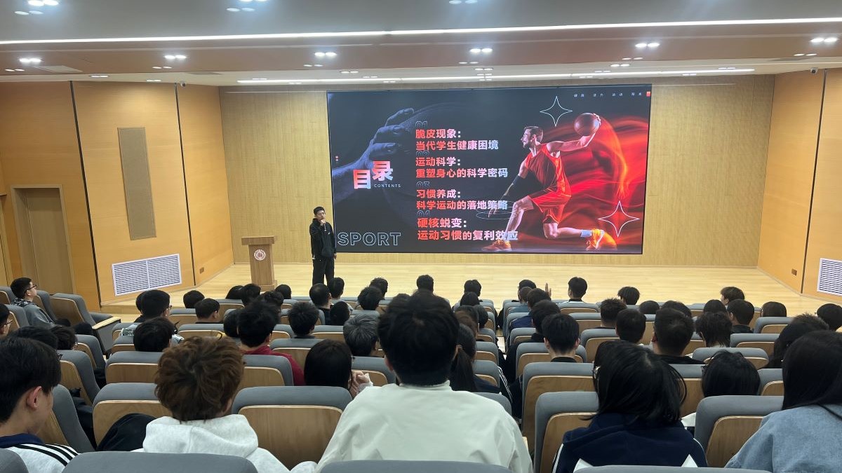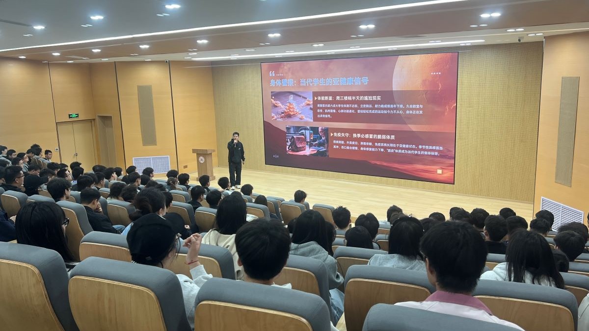 “体测不达标、爬楼喘不停、换季易感冒、焦虑常相伴,越来越多同学陷入‘脆皮’状态,这正是身体发出的健康警报。”闫老师以校园高频现象开场,用真实数据与鲜活案例直击痛点,现场气氛迅速升温。他从体能断崖、免疫失守、心理困境三方面深入剖析当代学生的健康难题,指出久坐不动、作息紊乱、缺乏锻炼是导致身心亚健康的核心原因,让同学们清晰看见自身习惯与健康状态的紧密关联。