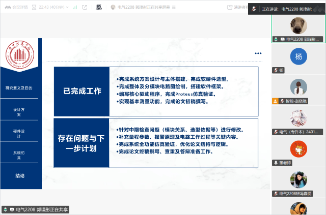 本次中期检查工作分为22个检查小组。各组指导老师交叉检查毕业设计是否按任务书计划完成各阶段任务、研究方向是否出现偏差、内容是否与题目、开题报告保持一致、撰写格式是否规范等问题,中期检查工作小组组织全部毕业生进行线下和线上中期答辩。学生对毕业设计开始以来所做的具体工作和取得的进展、目前存在的问题、下一步的主要研究任务、具体设想和安排等内容进行梳理,通过制作PPT汇报了毕业设计中期成果。各小组指导老师根据学生的汇报进行点评和指导,对发现的问题提出整改措施。