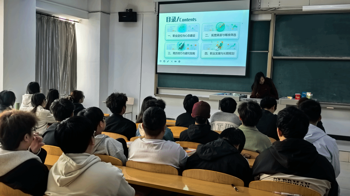 活动伊始,辅导员结合近年来高校毕业生就业数据和典型成长案例,深入分析了当前就业形势与行业用人趋势。他指出,大二学年是专业学习与职业意识共同成长的“关键窗口期”,也是积累实习经历、提升可迁移能力的黄金时间。“等到大四才做简历,会发现无话可写;等到毕业才想出路,会陷入被动焦虑。”辅导员用真实案例提醒同学们,就业创业准备不是大四的冲刺跑,而是一场从大二就开始的马拉松。