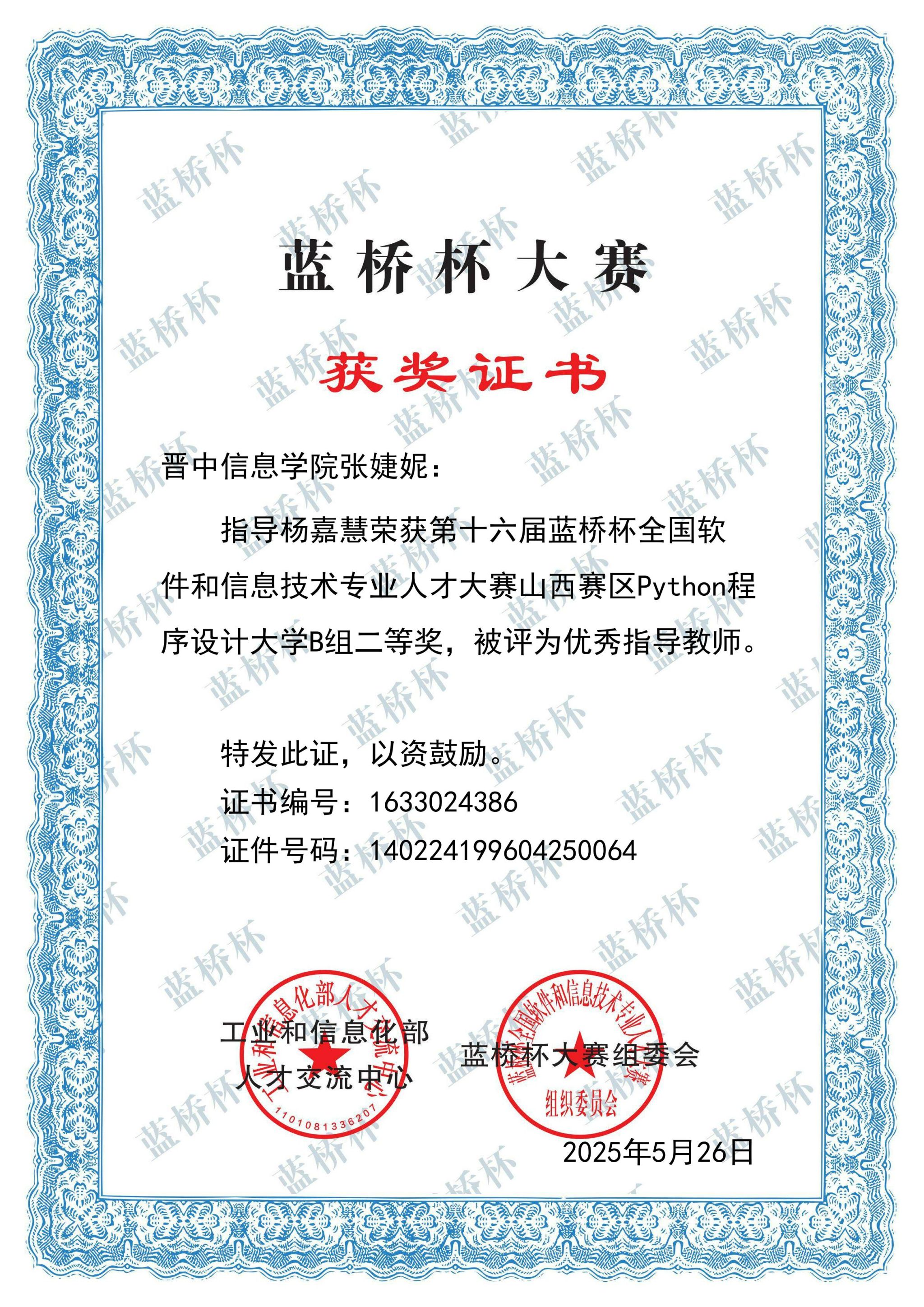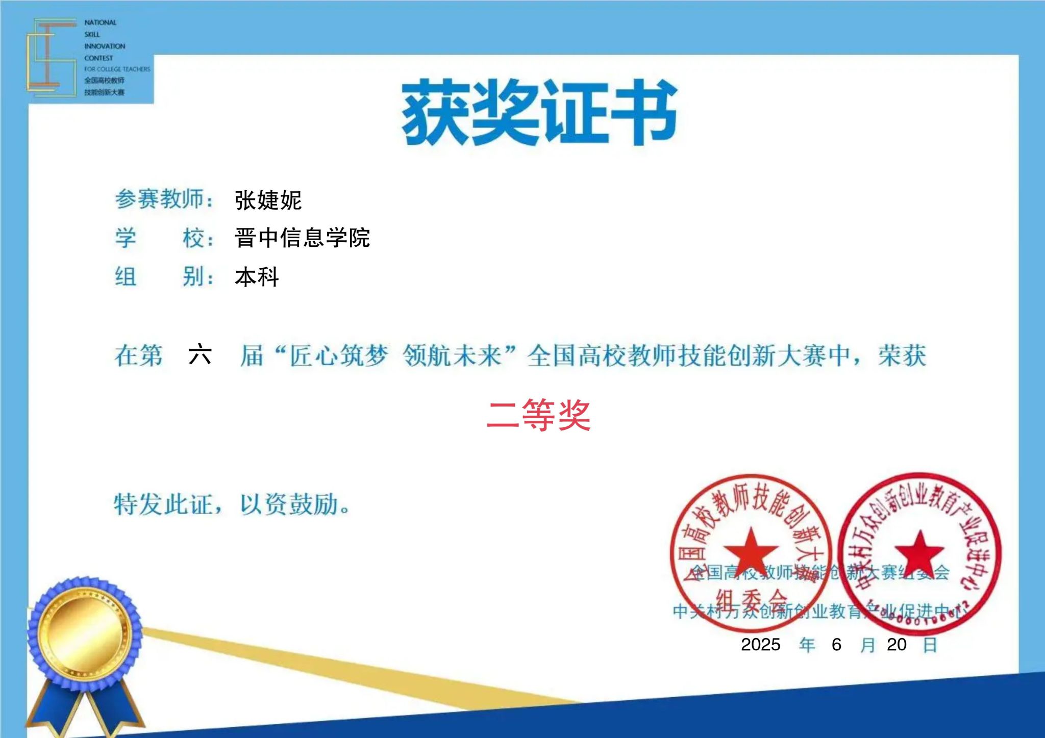 张婕妮,太原理工大学电子信息硕士,2023年入职晋中信息学院,担任专职教师、淬炼商学院异科导师。主要任教《机器学习》《Python 程序设计》等课程。入职两年以“教学-科研-竞赛指导”三维成果实现快速成长:获评校级课程过程性考核改革优秀案例1项,获第六届“匠心筑梦领航未来”全国高校教师技能创新大赛二等奖,以第一作者发布国家级期刊1篇。多次指导学生参加“全国大学生电子设计竞赛”“中国高校智能机器人创意大赛”“iCAN大学生创新创业大赛”等多项学生竞赛,累计获得省级奖项36项,国家级奖项1项。并7次荣获“优秀指导教师”称号。