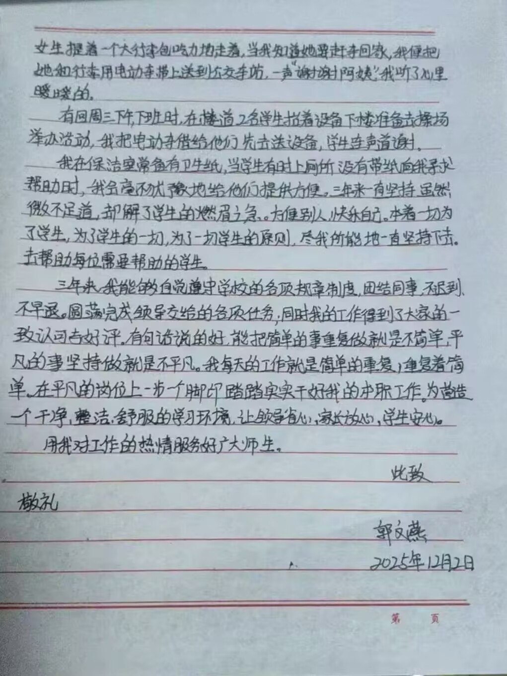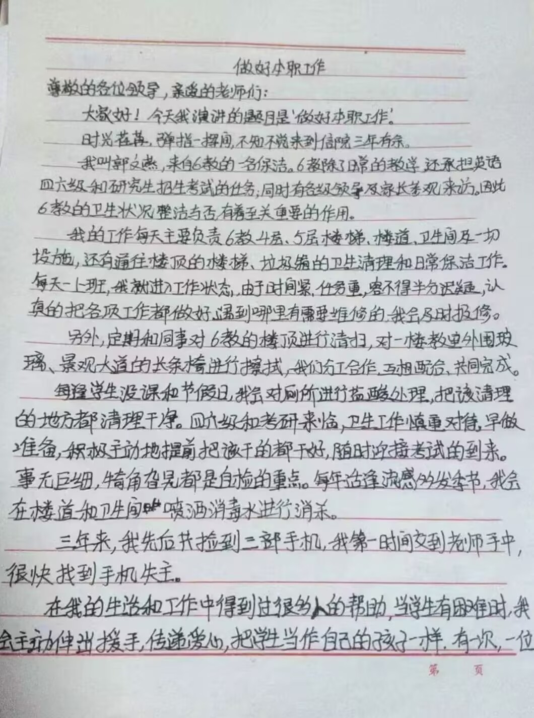 “我主要负责六教4层、5层的楼道、楼梯、卫生间等地方的卫生清理和保洁工作......”她用标准的普通话一字一句的说着。“老师和同学们总感谢我把教学楼打扫的干干净净,可我知道,我更该感谢的是他们,每次看到我正在拖地,他们都会向我致谢,有时候不小心踩了刚拖得地,他们还会致歉,甚至会绕到另一个楼梯间上楼;看到我往楼下搬垃圾,孩子们还会主动搭把手;孩子们抱着书路过喊一句阿姨好我能开心好久......”